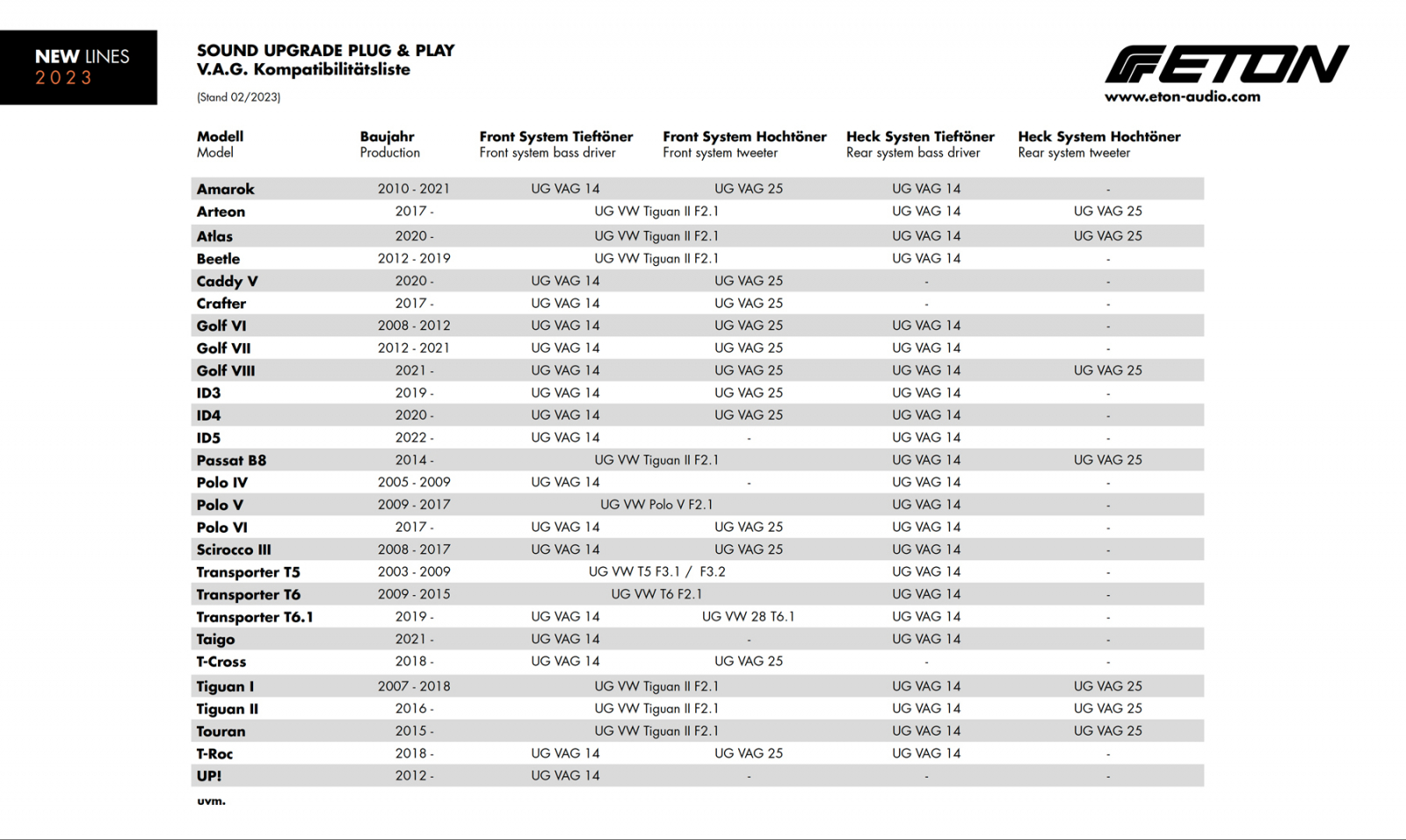 Tweetere de 25 mm (1") plug and play, din țesătură acoperită, cu volum de cuplare, amortizate pe mai multe niveluri, cu magnet puternic din neodim și flanșă de conectare în 3 puncte tipică V.A.G., special concepută și adaptată universal. Crossovere de cablu de înaltă calitate cu reglaj de nivel și fișă cu conector dublu. Impedanță de 4 Ohm, 50 W RMS putere de manipulare, precum și 90 W muzică putere de manipulare, Se potrivește în multe modele V.A.G. actuale. Fabricat și dezvoltat în Germania.