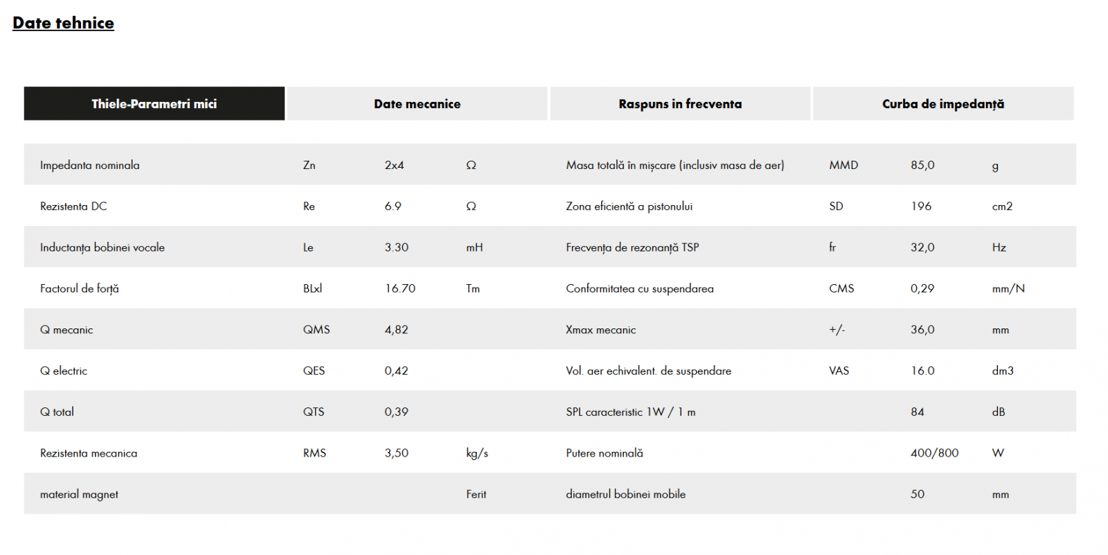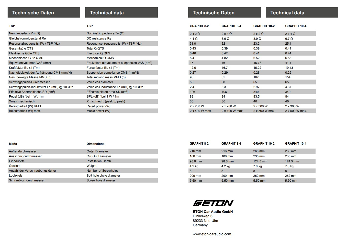 Legendele nu pot fi inventate, ele se nasc. Cele mai bune sisteme și seria de subwoofere ale noastre combină cunoștințele noastre de la peste 35 de ani de construcție a difuzoarelor cu cele mai bune materiale. Proiectat și fabricat în Germania. Aceasta este calitatea pură pe care o puteți vedea și, mai ales, o auzi! Astfel, noua serie GRAPHIT întruchipează toată conștientizarea noastră de calitate, cererea noastră de sunet și performanță. Această serie impresionează prin design și performanță: bobină duală de 2 x 4 Ohm, extrem de încărcabilă termic. Magnet de ferită extrem de puternic, cu piese din fier fabricate de înaltă calitate, cu orificii de ventilație și orificiu mare pentru miez turnat pentru o ventilație optimă și pentru a evita efectele de compresie. Nouă diafragmă sandwich din lână de carbon, foarte rezistentă la torsiune. Terminale de conectare nou dezvoltate și coș nou din aluminiu turnat sub presiune. Un subwoofer într-o clasă proprie pentru lovituri extrem de rapide, dinamice, atacuri puternice și pasaje de bas profund impresionante! Producție și dezvoltare Made in Germany.