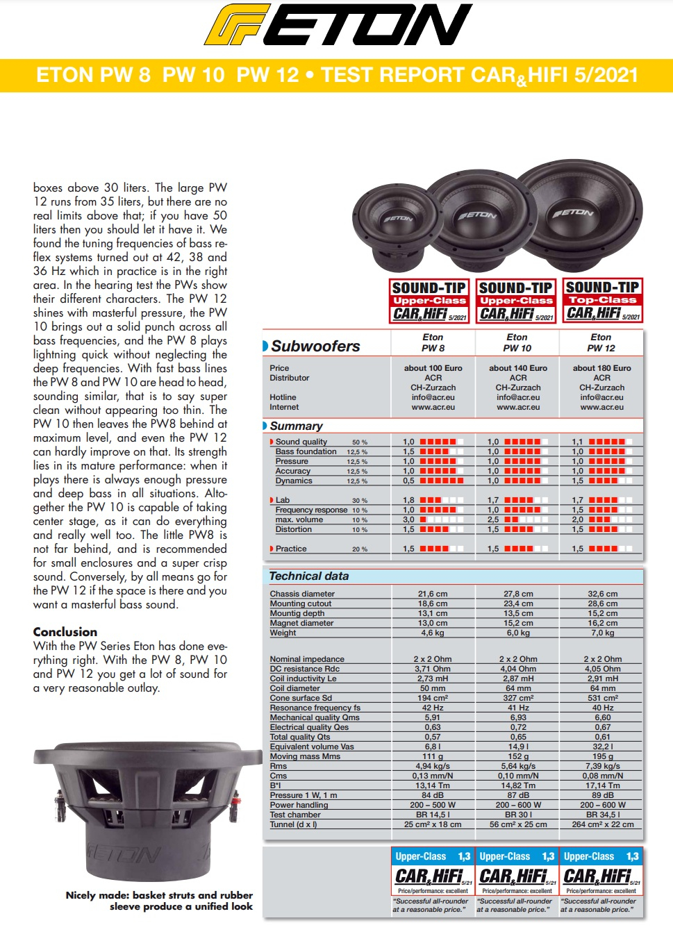 PW înseamnă POWER - dintre care există mai mult decât suficient. Noua serie powerhouse din clasa entry-level. Performanță completă - sunet - dinamică - nivel - adâncime. Șasiul bobinei vocale duale de 2 x 2 ohmi convinge pe tot parcursul liniei, conul de hârtie scos, rigid și presat produce un caracter sonor puternic, cald și puternic. Puncturile dinamice, precum și pasajele de bas extrem de joase nu sunt o problemă! Datorită spumei cu cursă lungă înconjurătoare în combinație cu magnetul de ferită extrem de puternic, pot fi generate presiuni sonore bogate.