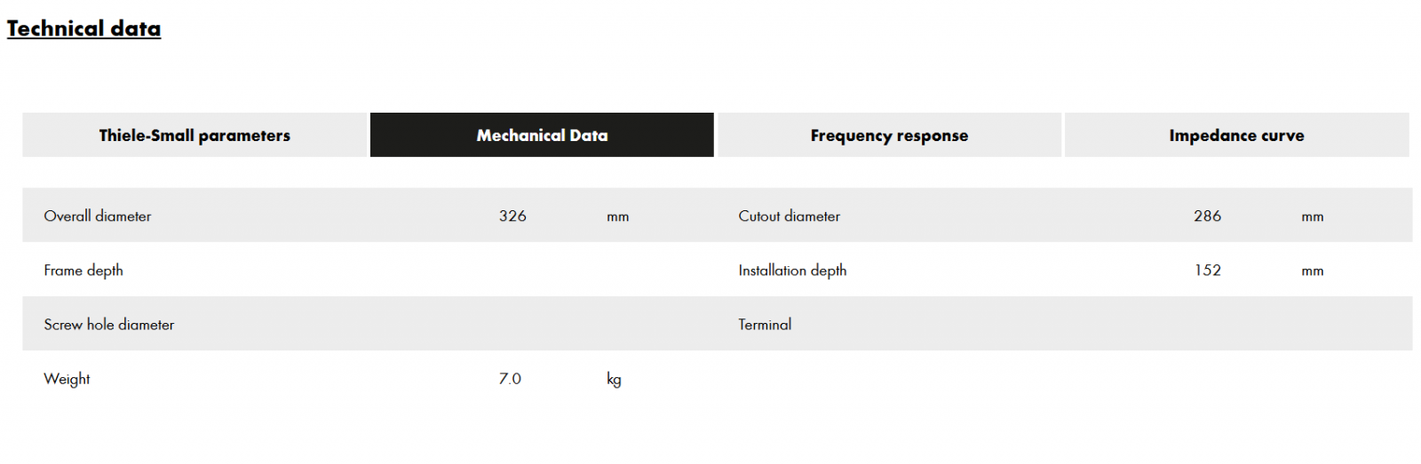 Subwoofer nou dezvoltat de 300 mm (12") cu diafragmă de hârtie presată, rigidizată și acoperită, înconjurător cu excursie lungă și magneți de ferită extrem de puternici, cu orificiu mare de miez pentru o ventilație optimă. Coșul metalic nou dezvoltat a fost deformat 3D pentru o rigiditate optimă. Bobina vocală duală mare de 2 x 2 ohmi este extrem de rezistentă, manevrabilitate 60000000 RMS Manevrarea puterii muzicale și o presiune sonoră caracteristică de 87 dB, Șasiul de 7 kg este protejat de un capac de protecție din silicon, special dezvoltat.